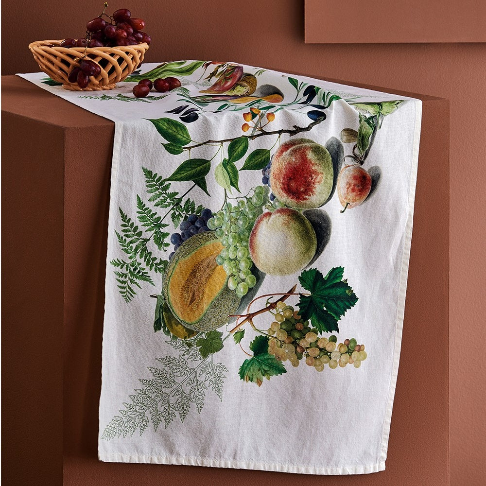 The Abondance D'Automne Natural Tablerunner epitomizes the bounty of the Fall season with its vivid depiction of fruits, vines, and leaves in green, red, and orange hues on a soft cream canvas. Crafted from a blend of cotton and linen, this tablerunner offers a charming touch of autumnal elegance. This printed design was crafted from original artwork, hand-drawn by our in-house team of textile artisans & designers in France. Combining the best qualities of cotton and linen, this fabric blend seamlessly enhances the table with its effortless appearance while providing durability and long-lasting performance. Enhance your dining experience with the Abondance D'Automne Natural Tablerunner, which beautifully captures the spirit of autumn with its vivid depiction of fruits, vines, and leaves, while its cotton-linen blend ensures both durability and sophistication.